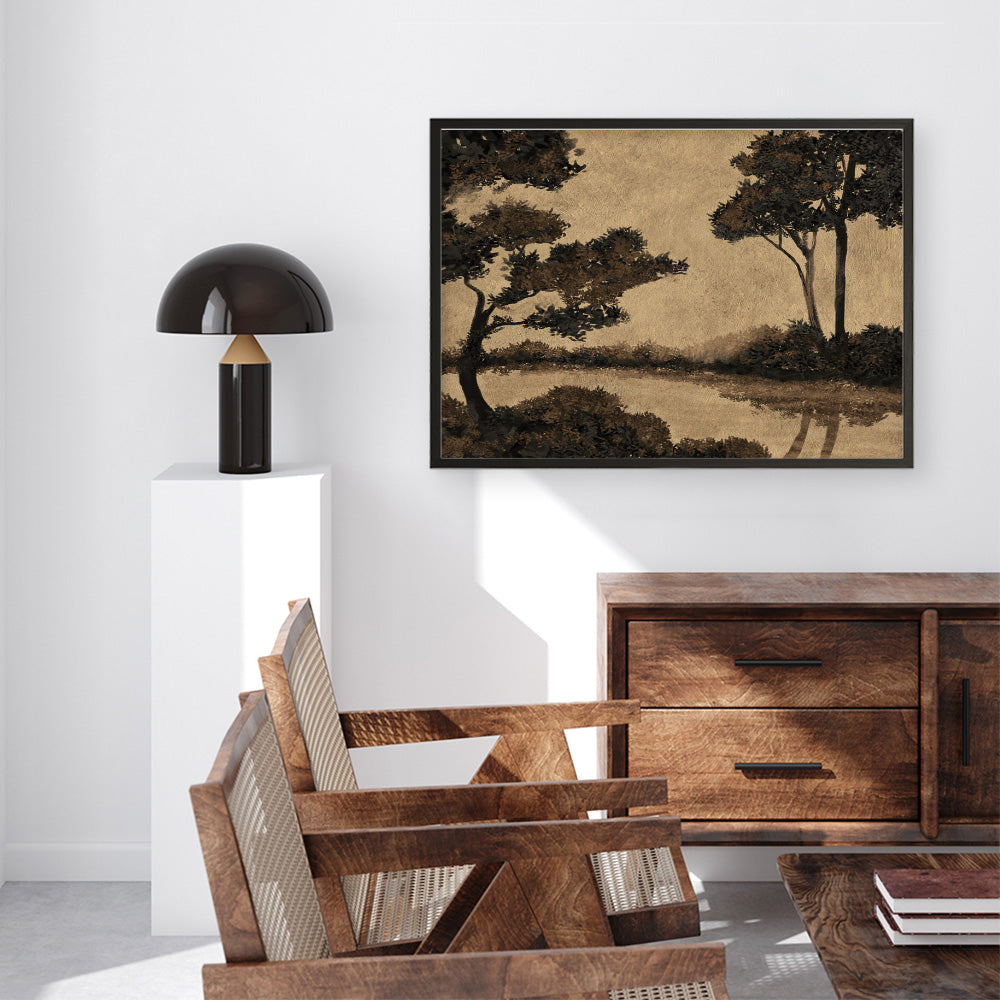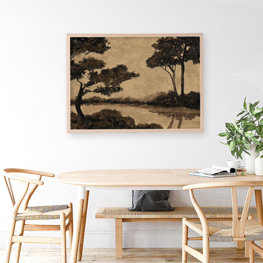 Shop Woodland Pond I Art Print and update your wall decor at home easily with this brown toned nature landscapes themed artwork print from our hand painted print collection by United Kingdom based artist Dan Hobday, now available on The Print Emporium. Dan creates artwork using a mixture of mediums including acrylic paints, inks, digital and also mixed media. All original artworks were designed and hand created by Dan and then digitised, and now available to purchase as reprints on paper or canvas and with framing options available.