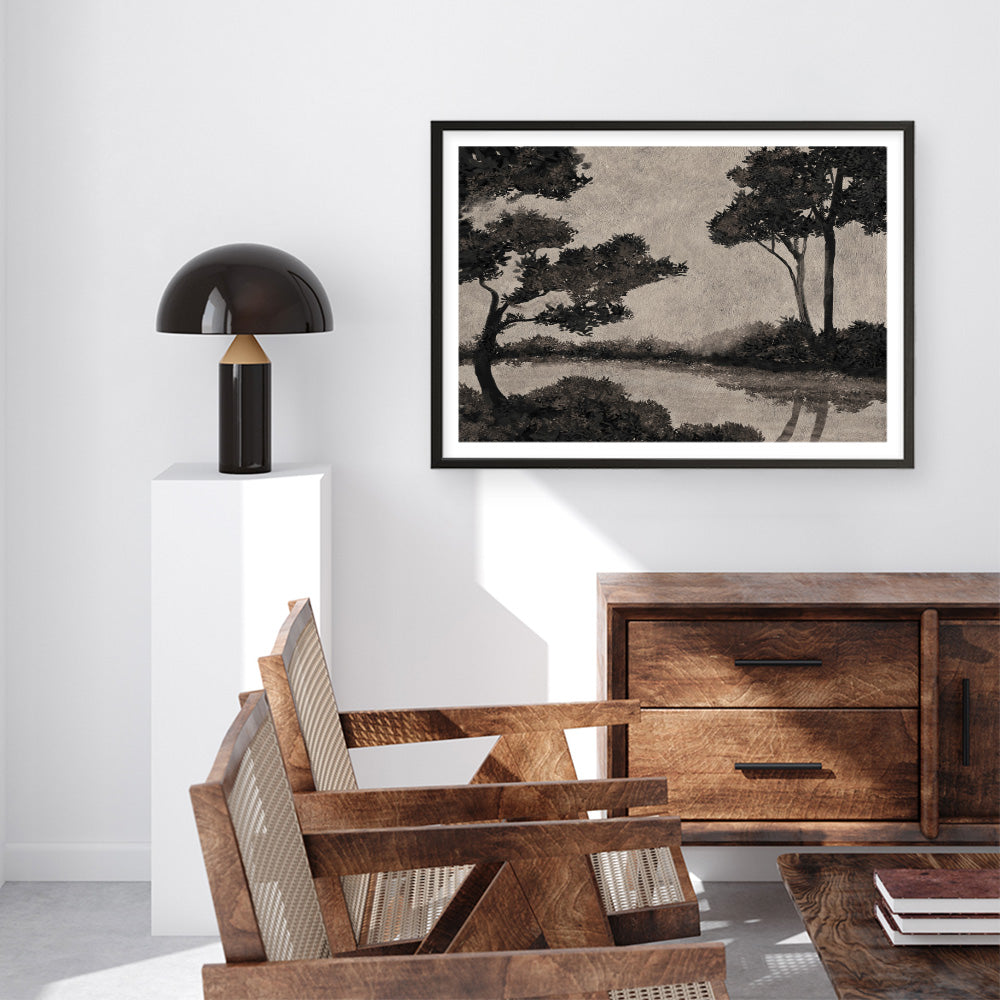 Shop Woodland Pond II Art Print and update your wall decor at home easily with this brown toned nature landscapes themed artwork print from our hand painted print collection by United Kingdom based artist Dan Hobday, now available on The Print Emporium. Dan creates artwork using a mixture of mediums including acrylic paints, inks, digital and also mixed media. All original artworks were designed and hand created by Dan and then digitised, and now available to purchase as reprints on paper or canvas and with framing options available.